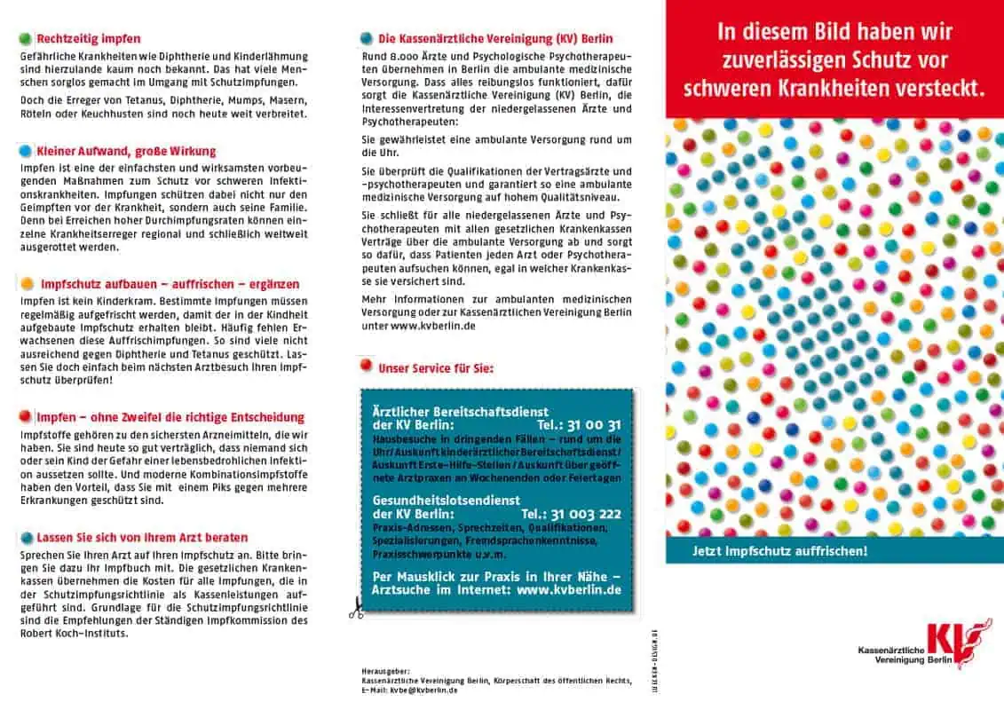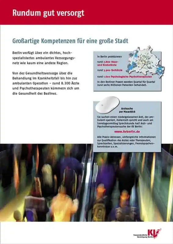 Die KV Berlin vertritt die Interessen der etwa 6.800 niedergelassenen Ärzte, 1.600 Psychologischen Psychotherapeuten und 240 ermächtigten Ärzte der Hauptstadt, die gesetzlich Versicherte behandeln dürfen. Als Teil der Selbstverwaltung im Gesundheitswesen stellt sie die ambulante medizinische Versorgung sicher. Lücken-Design unterstützt die Öffentlichkeitsarbeit seit 2007.