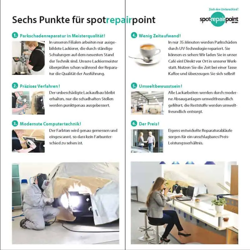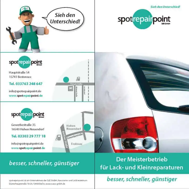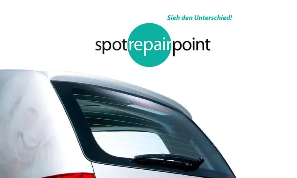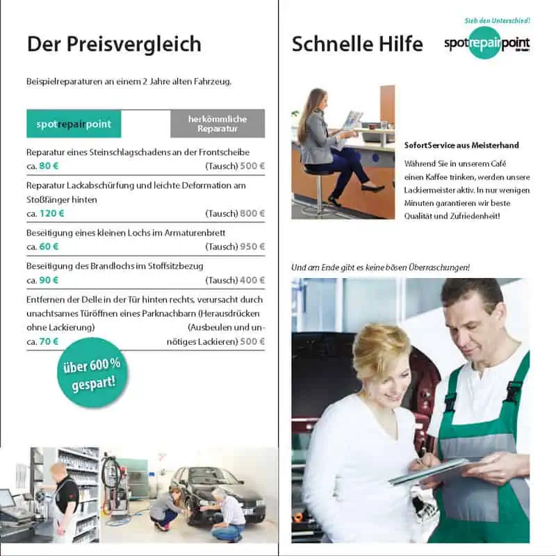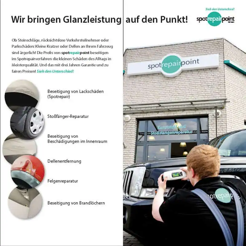 Sieh den Unterschied! spotrepairpoint hat sich auf kleine Schönheitsreparaturen von Kraftfahrzeugen spezialisiert. Lücken-Design hat das Logo und die Werbung gestaltet.