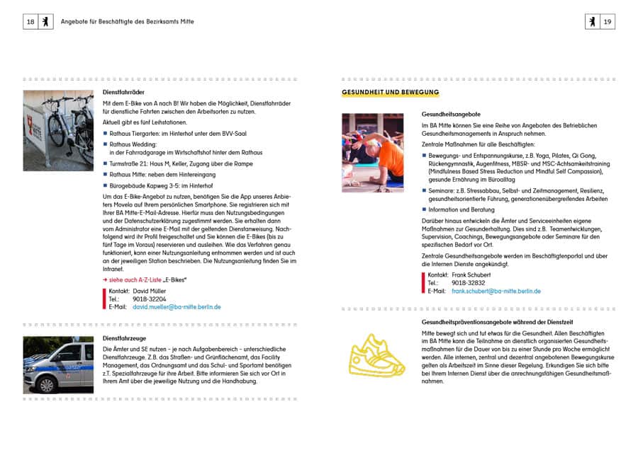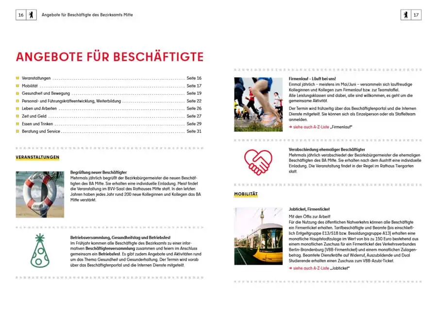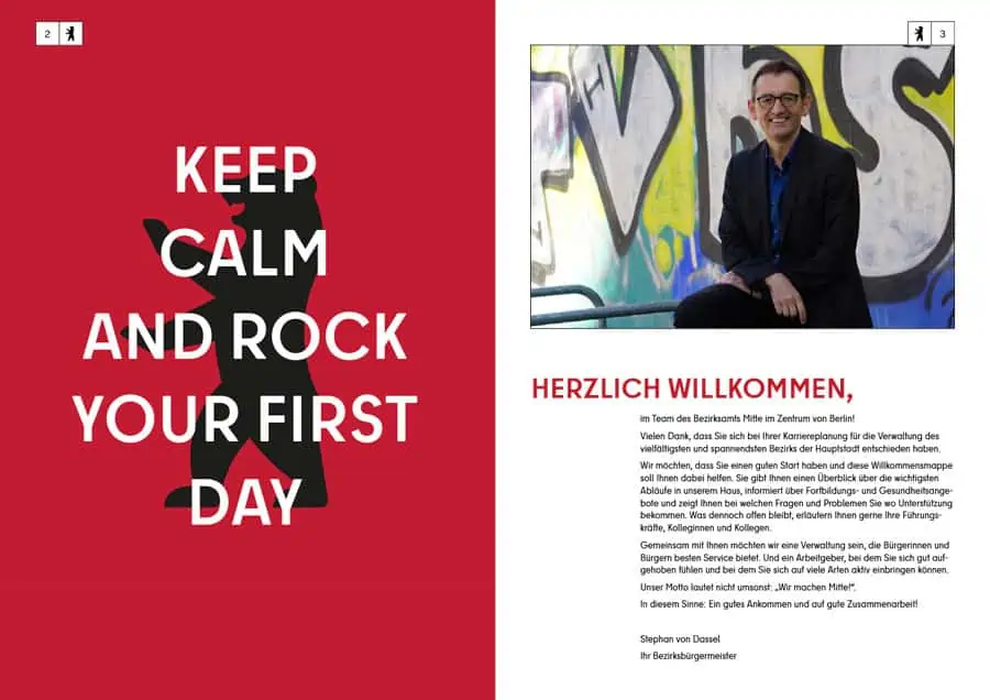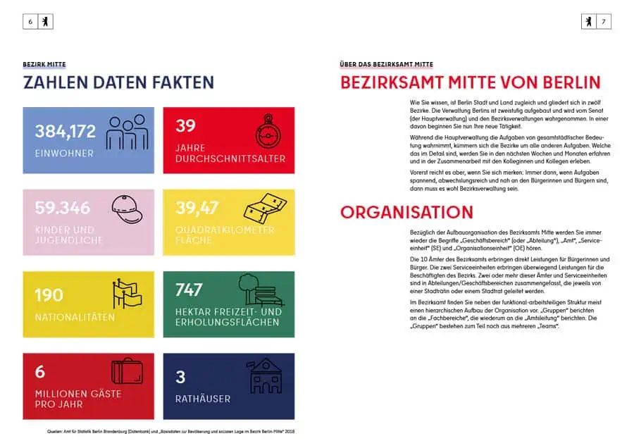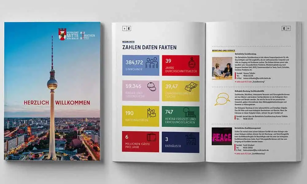 Um schneller die komplexen Strukturen einer Behörde und die speziellen Vernetzungen in einem Bezirk zu verstehen wurde diese Willkommens-Broschüre für den Berliner Bezirk Mitte konzipiert. Lücken-Design hat mit vielen Fotos und speziell entwickelten Icons die Broschüre übersichtlich und ansprechend gestaltet. Dabei wurde das neue Corporate-Design der Stadt Berlin eingesetzt.